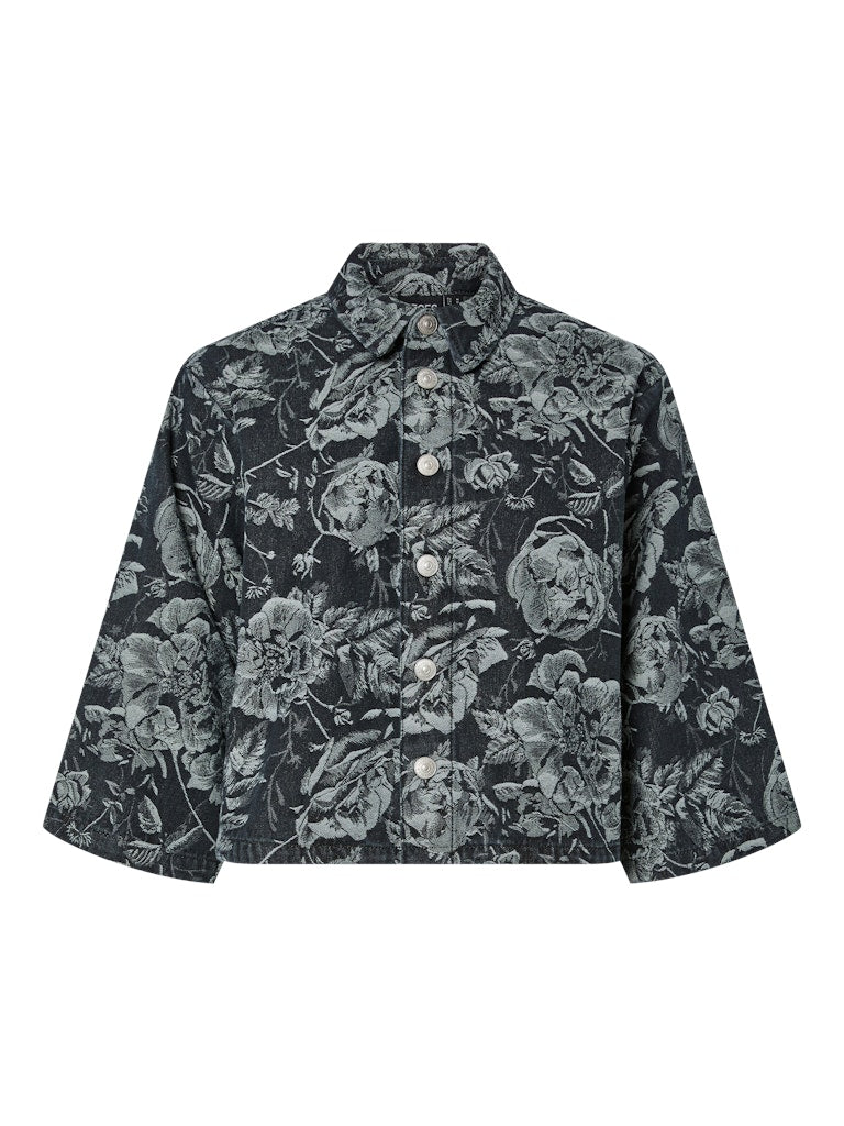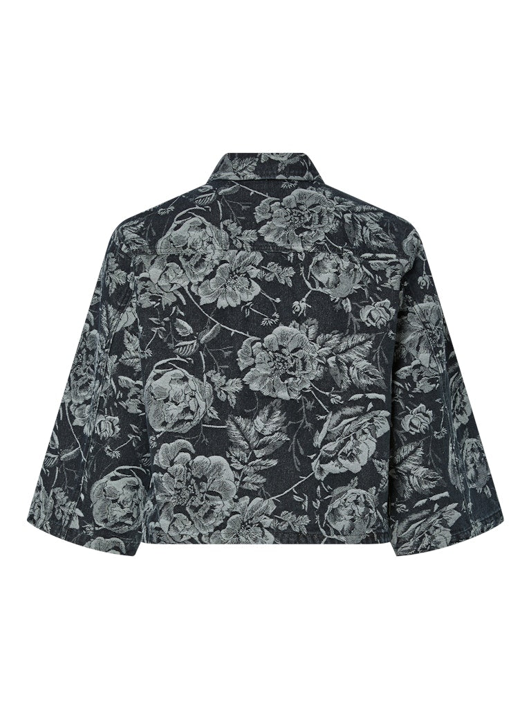 PIECES 3/4 Sleeve Floral Denim Shirt in Black